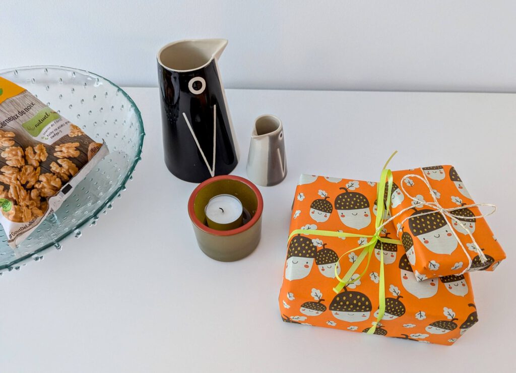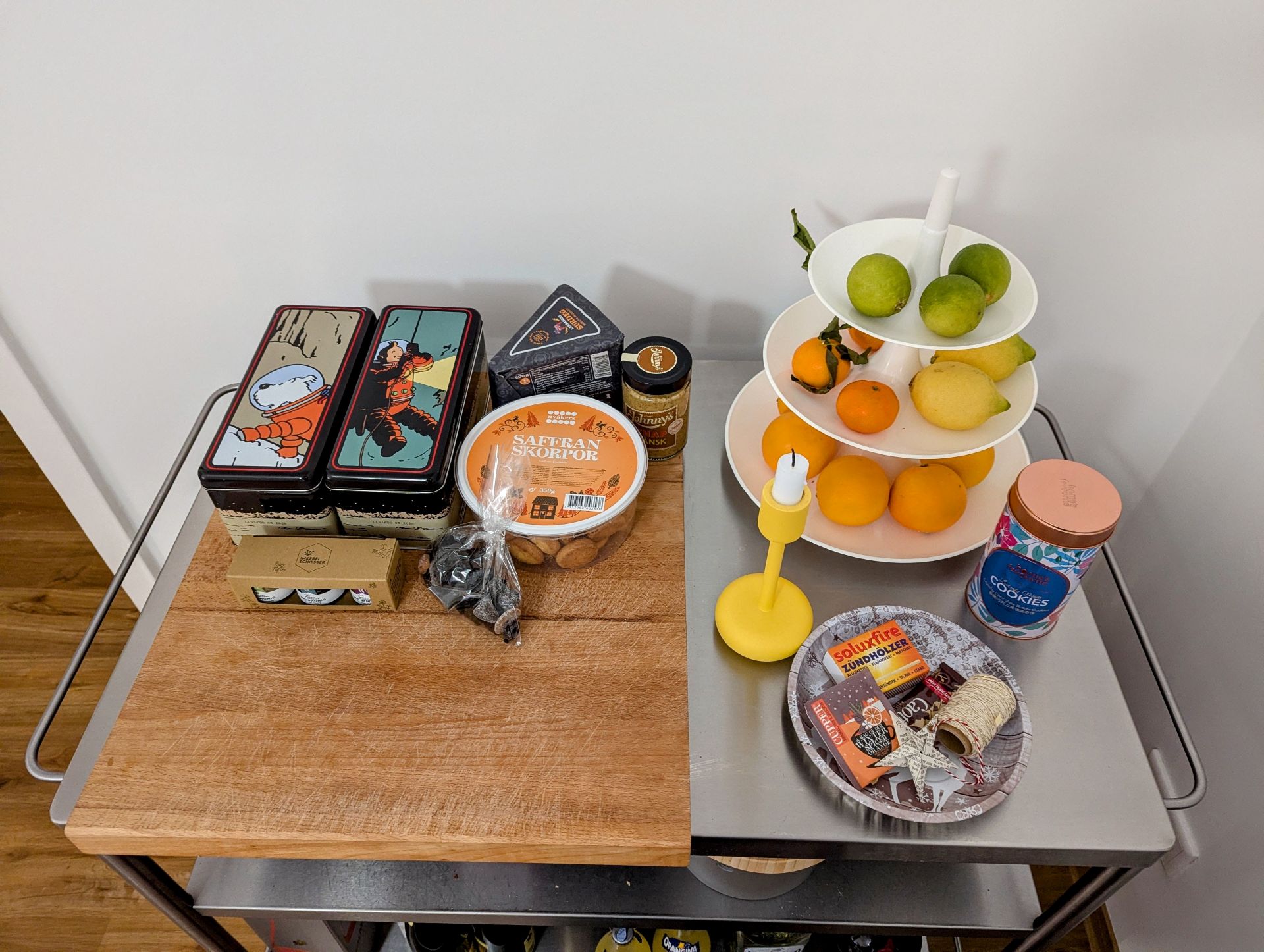 Clementinen und Orangen auf einer Etagere. Die lustigen Tim & Struppi-Keksdosen. Schwedische Lebensmittel vom Julbazar – Lakritz und Safrankekse. Auch schon verpackte Geschenke machen sich gut als kleiner Feiertags-Blickfang.