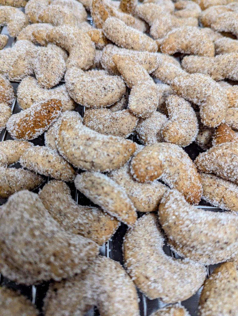 Als ich noch eine große Wohnküche hatte, habe ich jedes Jahr zum gemeinsamen Backen eingeladen: Alle brachten vorbereiteten Teig, ausgestochen, gebacken und dekoriert wurde gemeinsam. Danach haben wir Pizza bestellt und alle Plätzchen untereinander aufgeteilt.