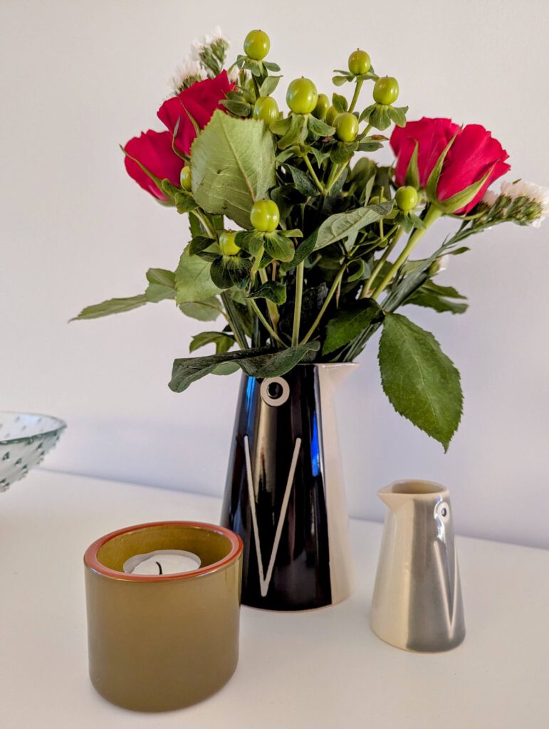 Heute habe ich Schnittblumen gekauft. Eine ältere Dame hinter mir in der Schlange hat mitbekommen, dass ich die Sträuße an der Kasse im Blick hatte, aber nichts ansprechend fand und sagte nur „Schauen Sie mal auf der anderen Seite, die sind schöner.“ Recht hatte sie.
