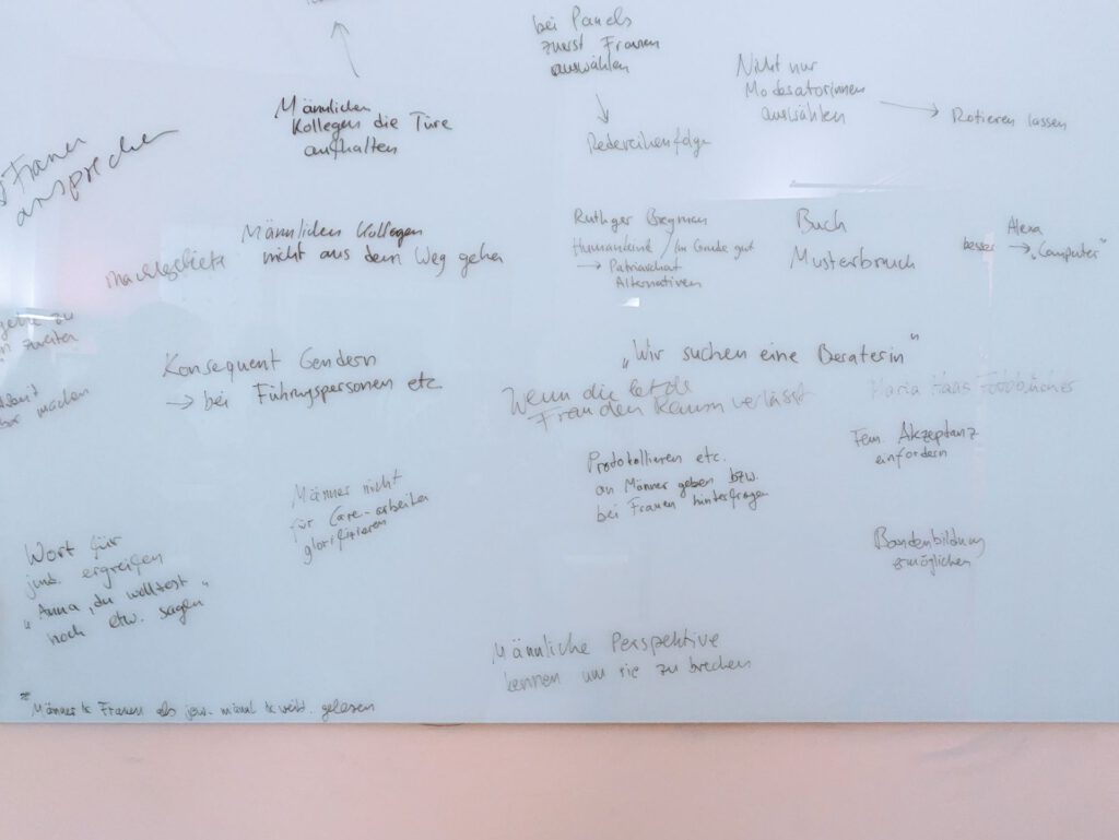 Im Anschluss an die Sammlung war noch etwas Zeit, weiter über das Thema Feminismus im Business zu diskutieren. Es ging um die Frage, ob Mikrofeminismus ausreicht, um eine echte Veränderung zu bewirken. Zwei Teilnehmerinnen haben Beispiele gegeben, wie sich Rollen in der Partnerschaft (im Business und privat) neu definieren lassen. Auch das Thema Intersektionalität wurde nochmal angeschnitten.