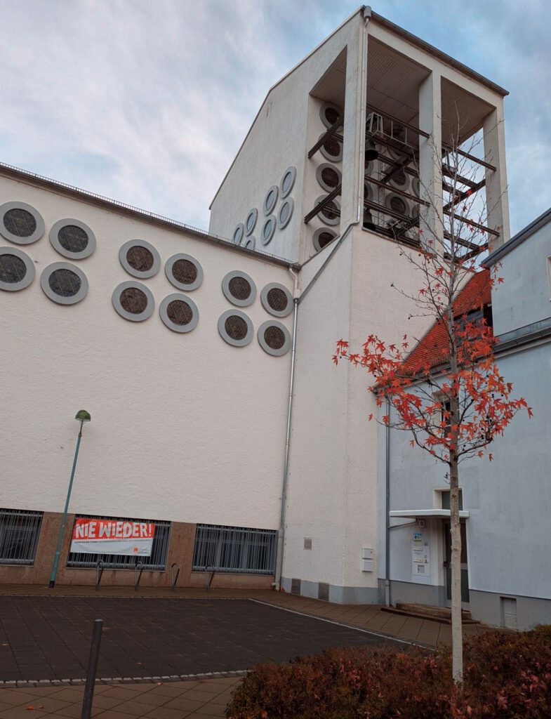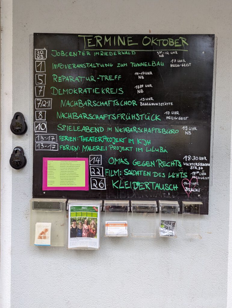 Vor dem Bürgertreff stellt sich uns jemand als Mitglied der Linken vor und spricht gerne über den Stadtteil und die Stimmung. Dass er noch nicht so lange im Riederwald wohnt, sich aber gut eingelebt hat – man kann mit den Leuten einfach reden, die Nachbarschaft hat einen guten Zusammenhalt. Die Proteste gegen die Reichsbürger hat er mitgemacht. Später werden wir ihn im Stehcafé wieder treffen.