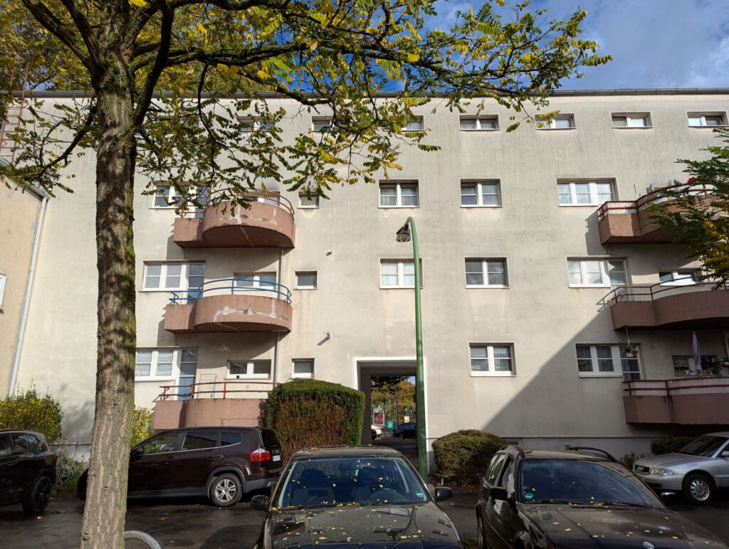 Ach so, mit dem neueren Teil meine ich tatsächlich die Bauten von 1926, die Siedlung steht unter Denkmalschutz: Die massiven Betonaustritte, die kleinen Sprossenfenster, die Treppen und Handläufe vor den Hauseingängen und Balkongitter.